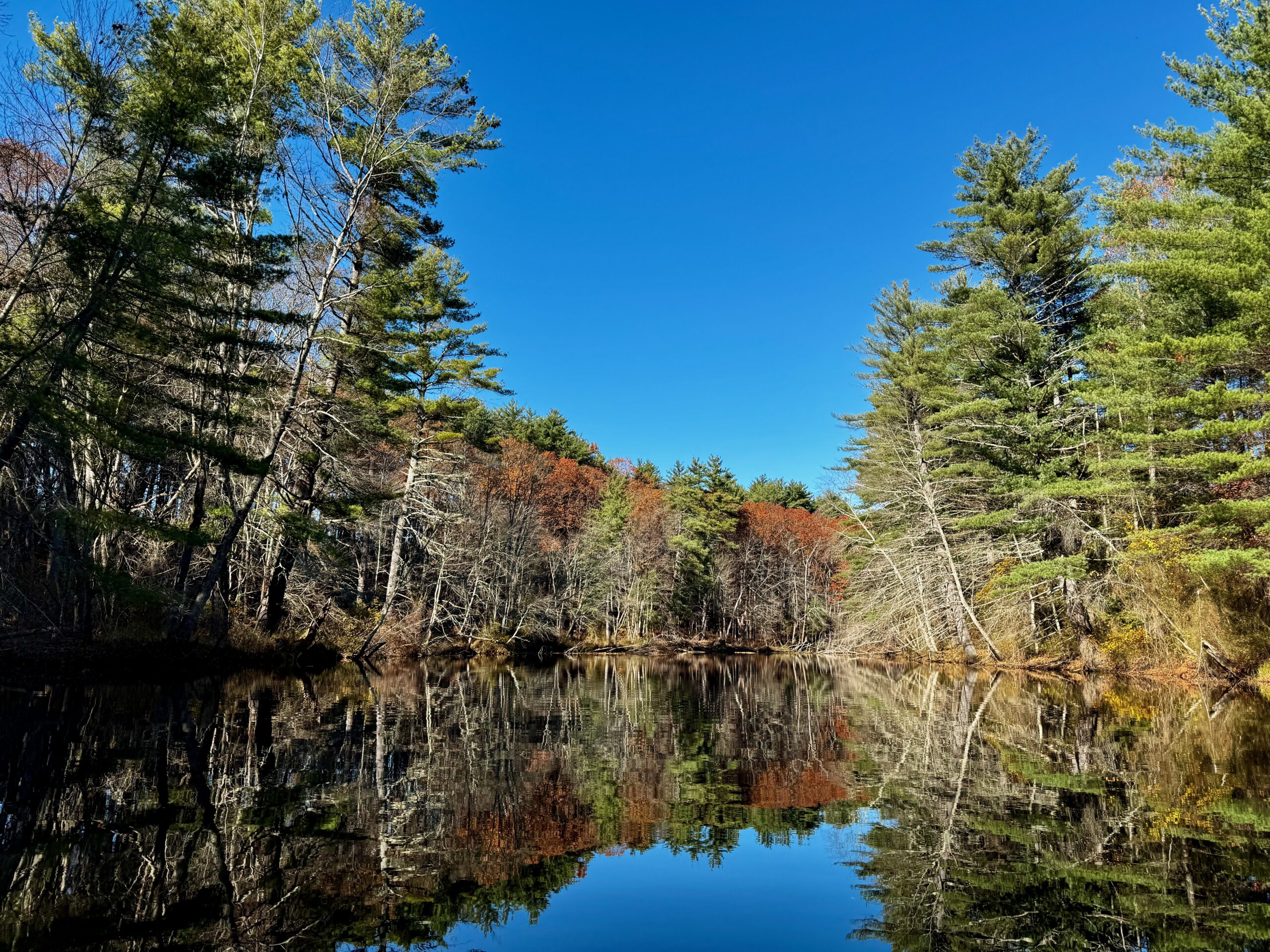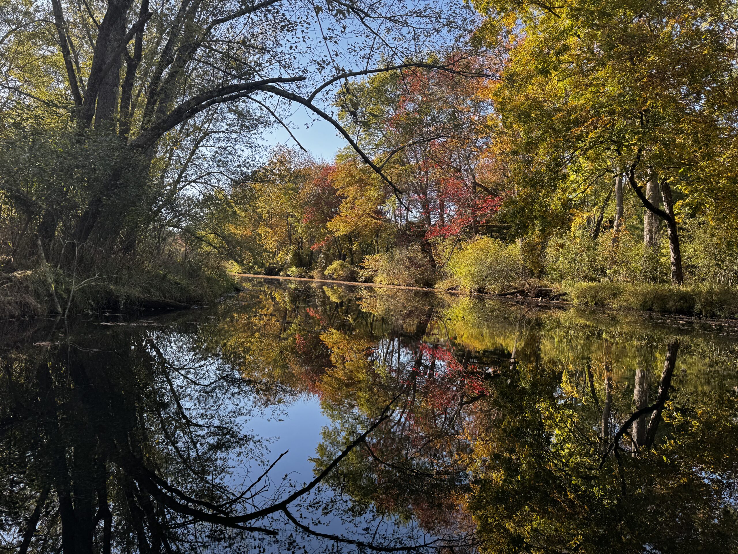 Beautiful view going north down stream toward Route 2 from Oxbow National Wildlife Refuge in Harvard on a warm October day in 2025. Water was very low and almost no current. It’s about 2 and a half miles to Route 2 bridge — no tree blockages.