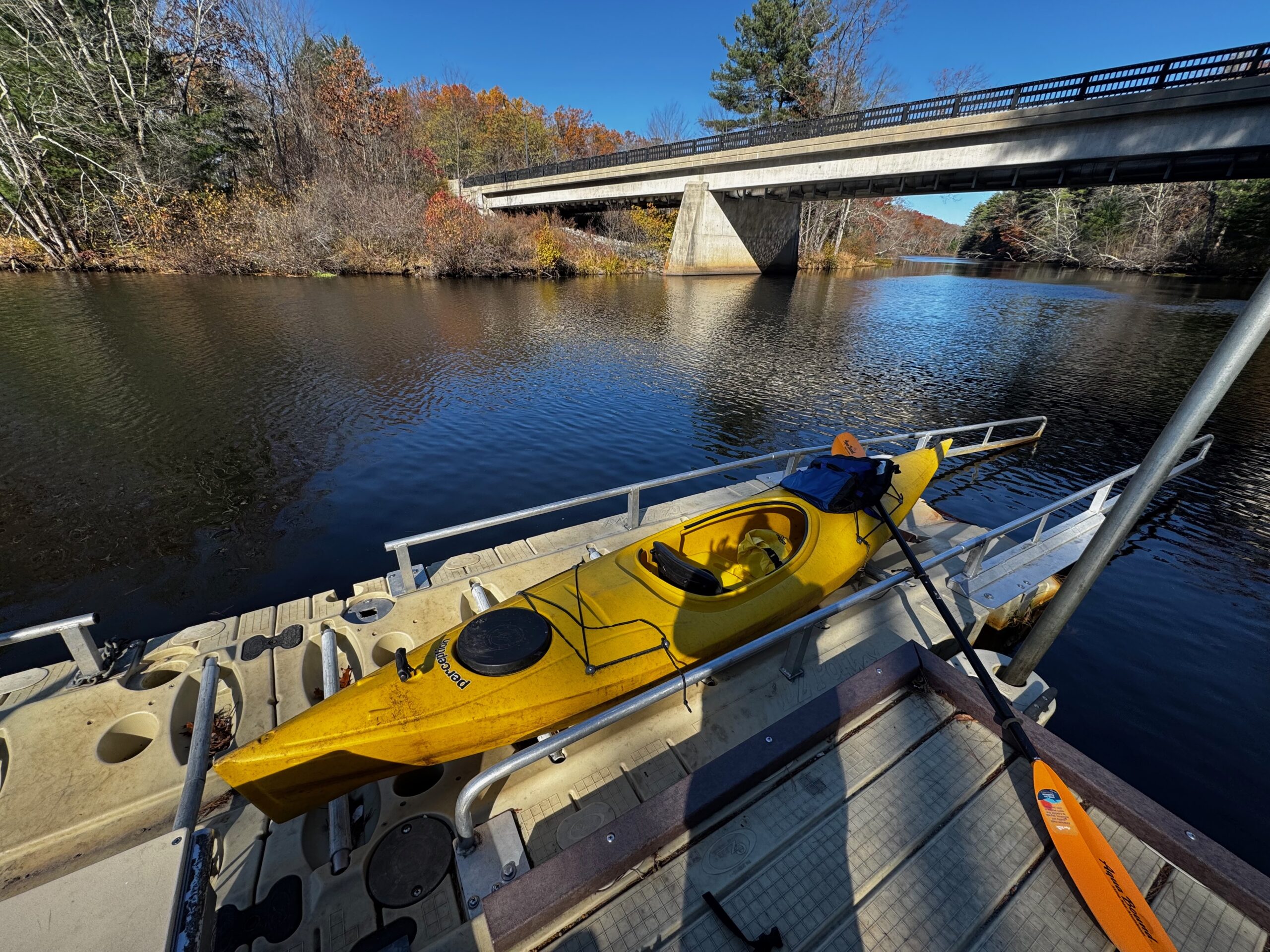 This has two ‘EZ’ kayak launches that make it really easy to get in and out. The route upstream south toward route 2 is pretty wide and quiet with refuge land on the left. It takes less than an hour to get to the route 2 bridge, where there are a couple of bridges to go under. Overall, really nice stretch and the part going upstream toward Harvard is quiet and nice as well, getting a bit more twisting turning once you pass route 2. We only went a short way downstream toward Shirley but that looks promising. There’s hiking as well at the Bill Ashe Visitors Center with mowed trail along the power line. There’s a short walk down a hill toward the dock and launches, making a second person or a wheeled cart pretty handy.